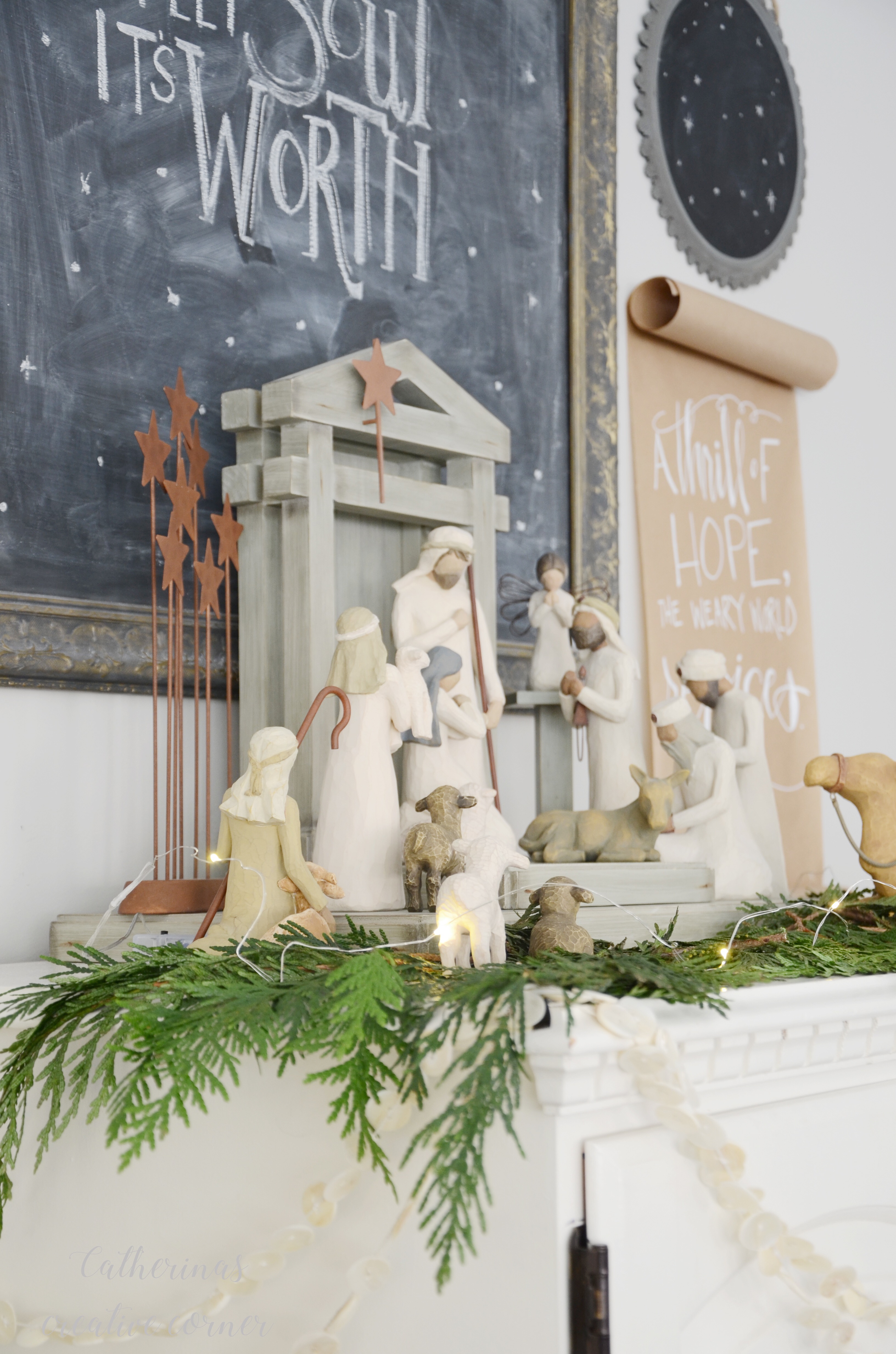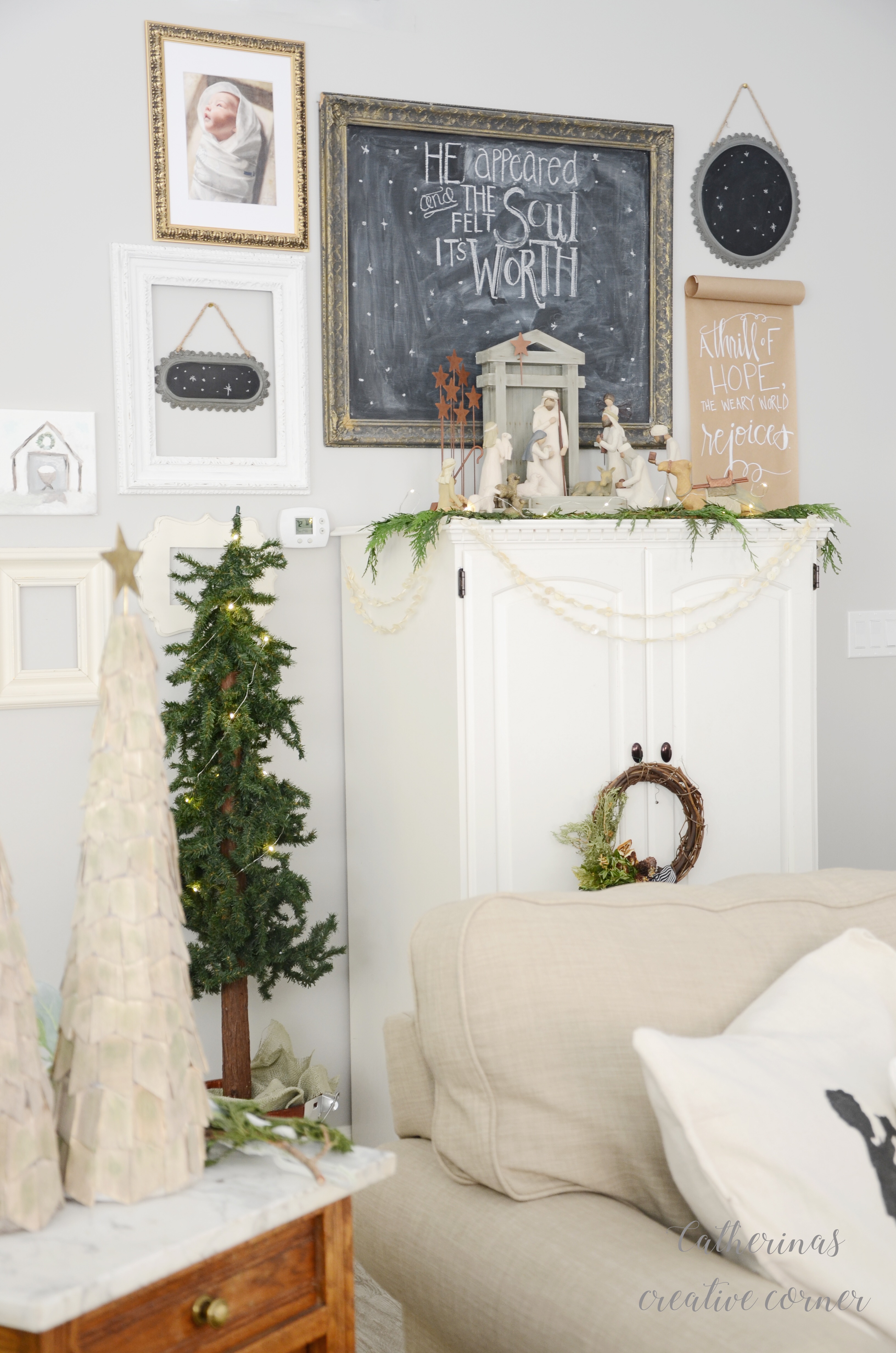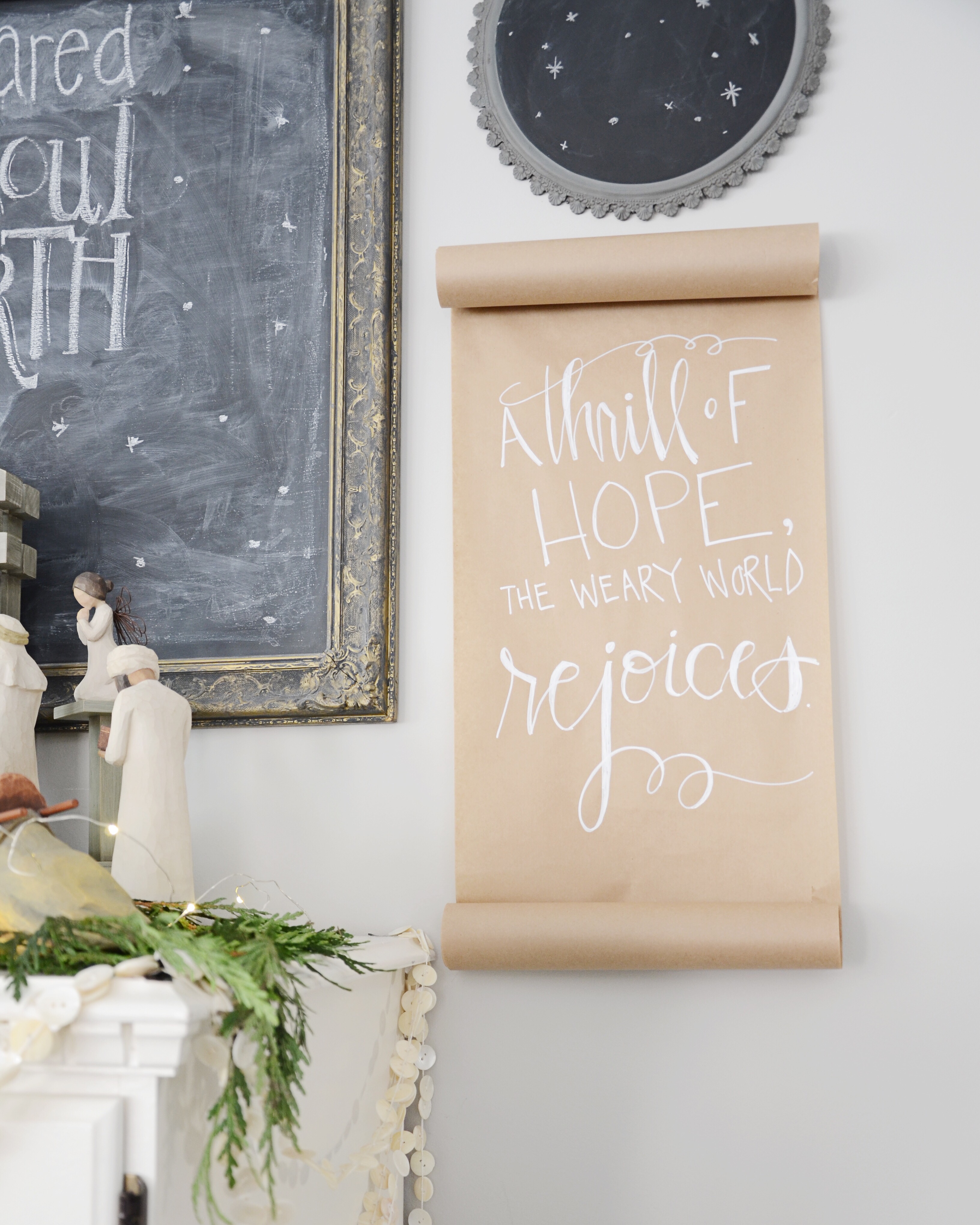 “A Thrill of Hope the Weary World Rejoices”! ……this is a little DIY scroll I made. (Really easy I just freehanded it and hung it up with some thumbtacks.)
