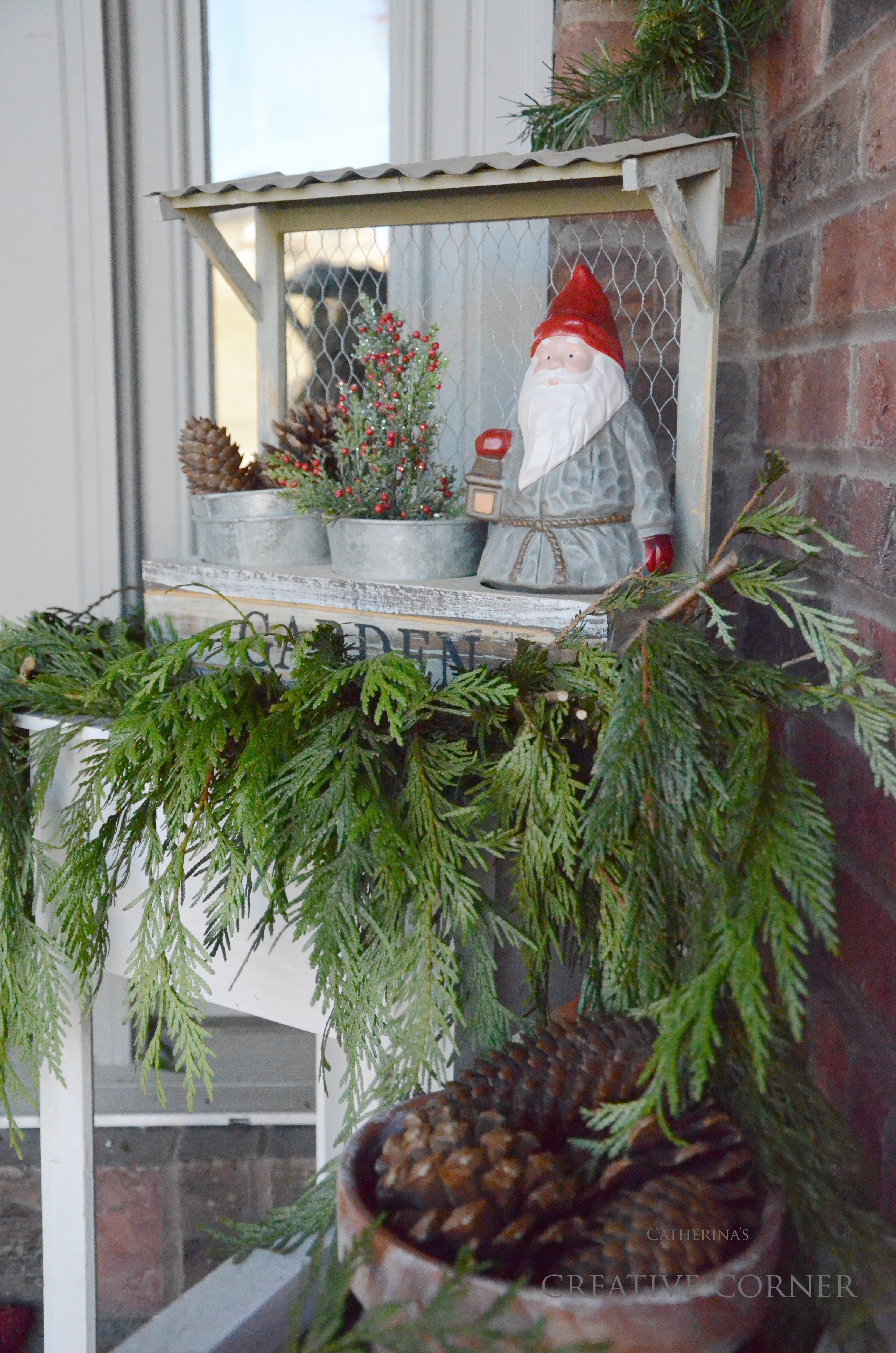 Here is my little “Nisse” aka Danish elf sitting in the cutest little garden “lean-to”… I kind of like him there…I also filled my empty terra-cotta pots with pine cones and used fresh greenery wherever I could .