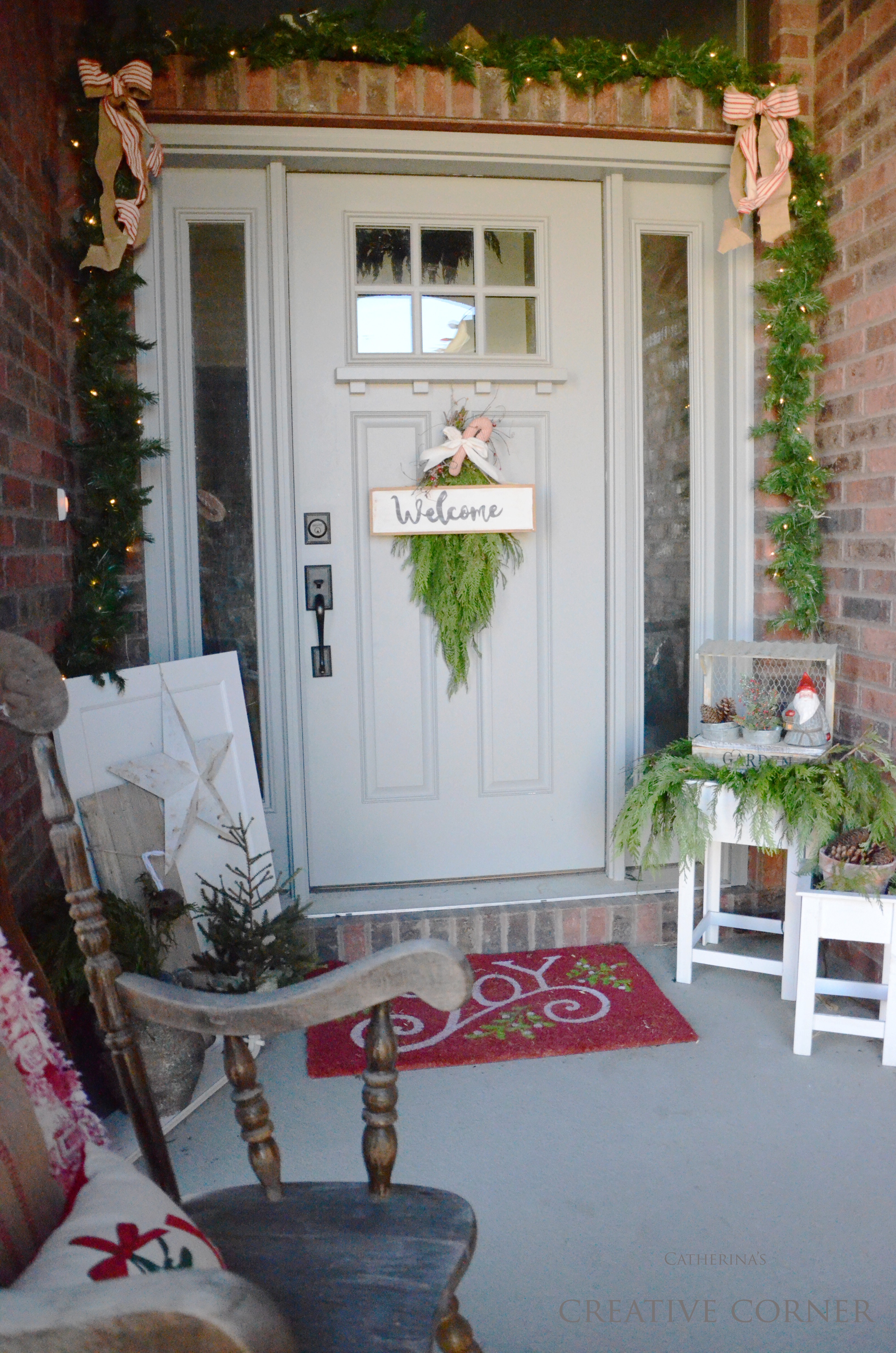 I’ve really loved to add some color to this entry…with the small striped reds here and there. I also have the same bows and fresh greenery on our garage lamps and mailbox but I totally forgot to take pictures of it all….let’s blame the mom brain for that one…k. Lol