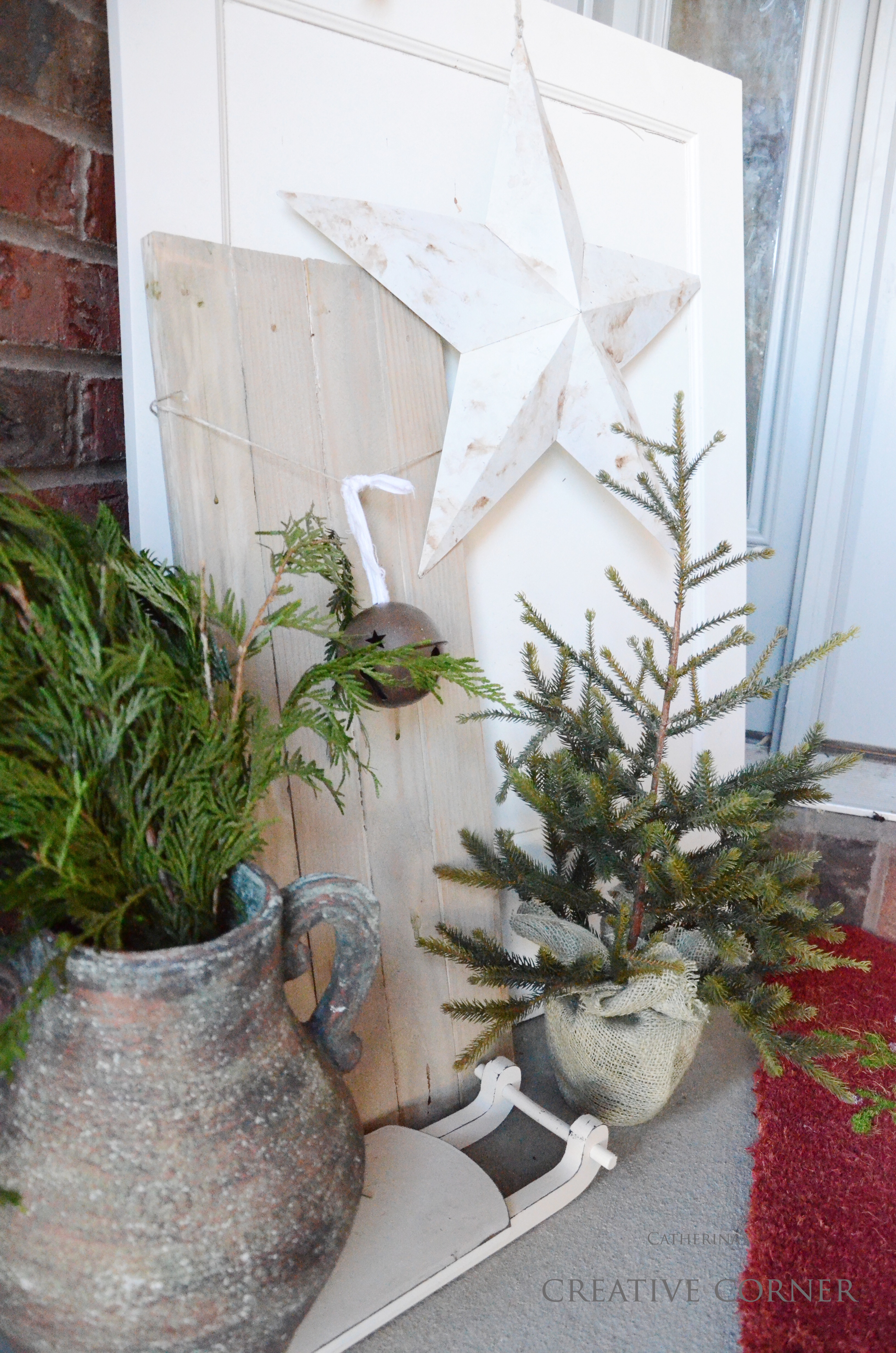 Ahhh…and than there is my all season “welcome” sign. I hand made this a few years ago, with a sharpie and some white paint and it’s still one of my favorites to date. I tied fresh cider pine into a swag and hung it on the back of the sign with some jute. A candy cane made out of ticking fabric and a bit of red berries…for the perfect farmhouse feel.