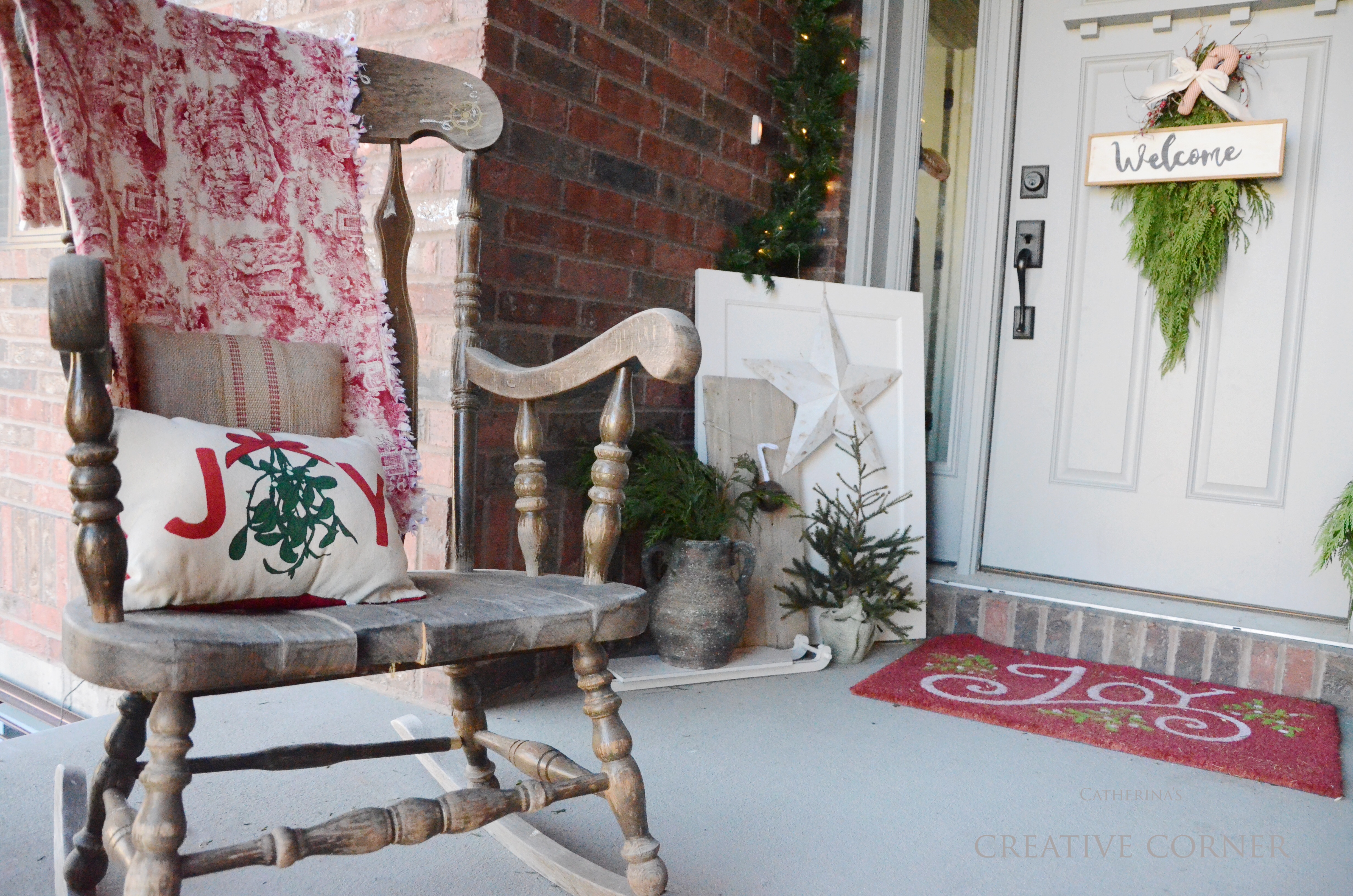Anyhow, I wanted to share with you my Christmas Porch this year. I’ve always loved to decorate our front porch, no matter where we have lived. This little porch of ours is neatly tucked away from the wind and rain, so I can safely place items out here that I treasure…