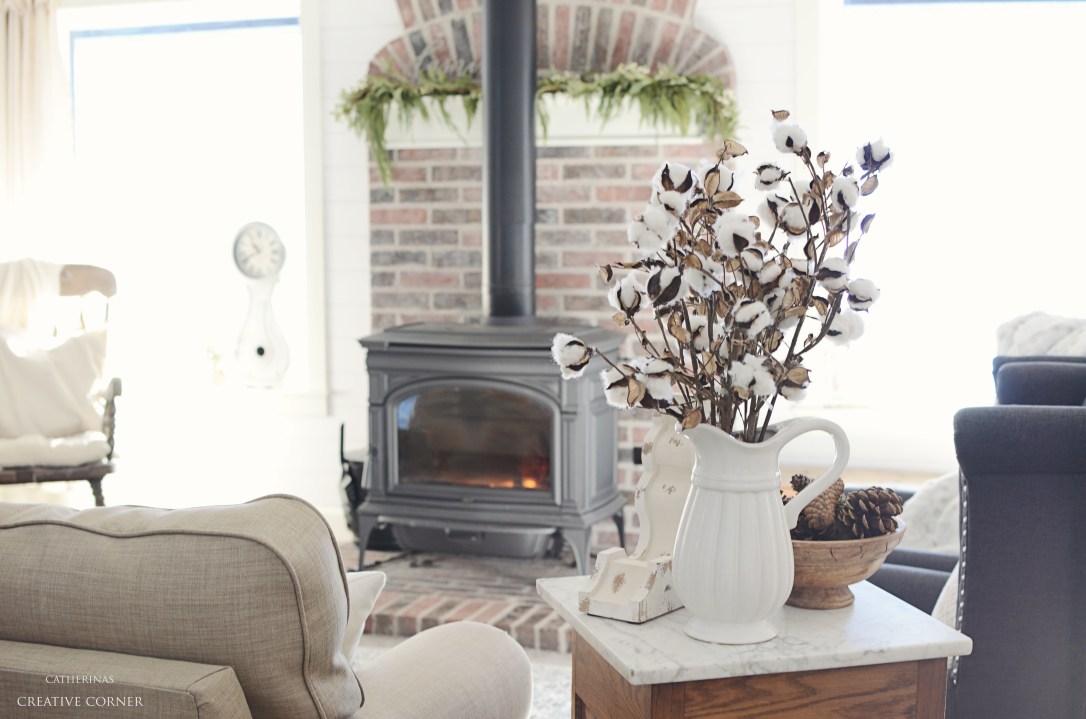 - I like to keep my color palette very neutral …colors I use are greens (I keep up several miniature Christmas trees for this), creams and any kind of natural decorations, like my cotton stems or every green garlands. I also try to layer whites with pillows and such, to create a cozy and comfy feeling… adding lots of candles and blankets/throws.