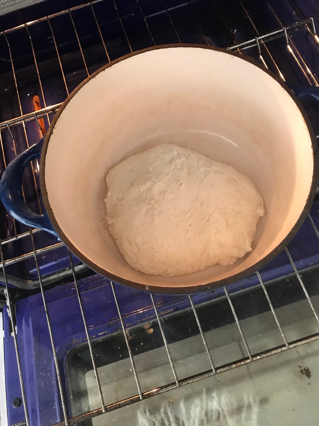 After the 30 minutes are up, carefully remove Dutch oven. With floured hands, place the bread dough into it. (You can put a piece of parchment under the dough if your Dutch oven isn’t enamel coated.)