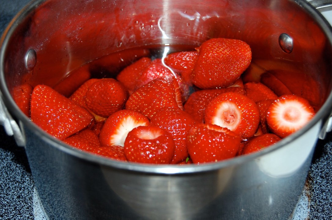 - Hull and rinse berries. Add to water and bring to a boil over medium heat. Add sugar and simmer until berries are tender, 10-15 minutes (depending on size of berries). Lower heat to medium-low.