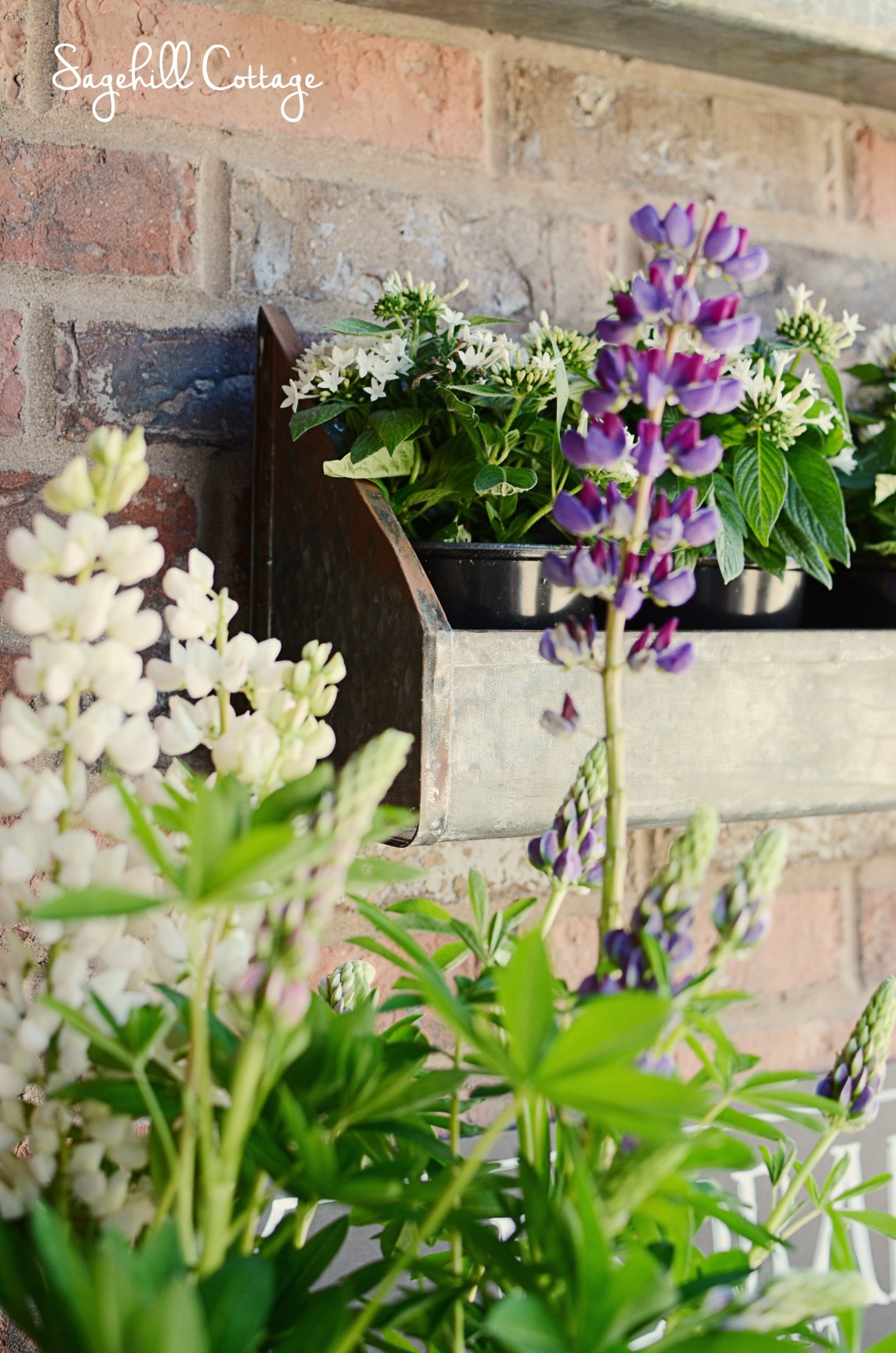 I kept these little white container flowers in their pots just for easy watering. I usually will take them out and water them before I water anything else in the yard. Once I am all done I come back to them and return them to their metal planters. It works great for making sure they dont get any root rot.