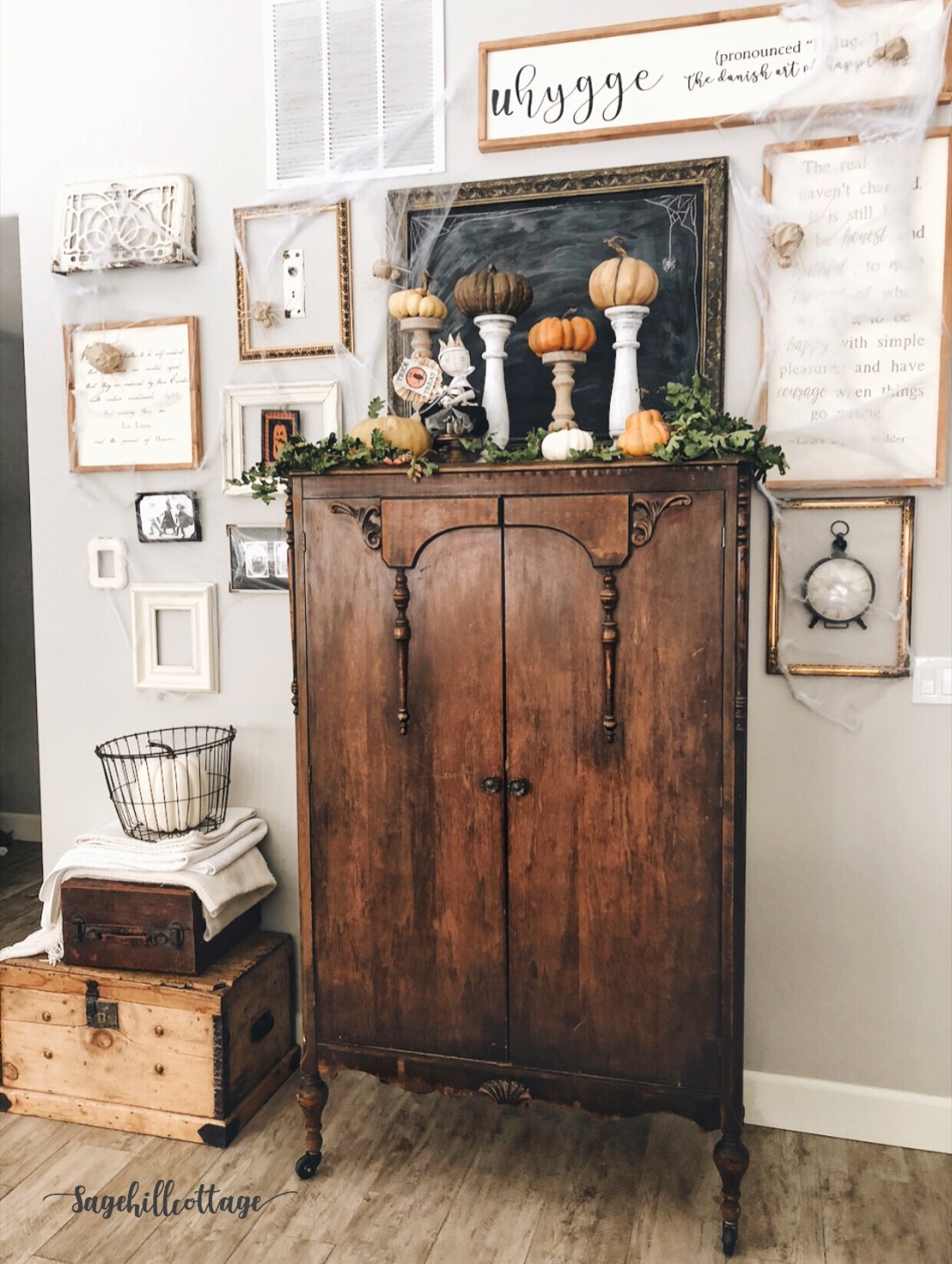If you are new to my blog this gallery wall is a place that gets a makeover with every holiday. Usually the “Uhygge” sign only says “hygge”….its the danish way of life..it describes the state of being cozy (more on that for another post). BUT in Danish if you place an U in front of it, it means “Scary”…kind of perfect for halloween…right? lol