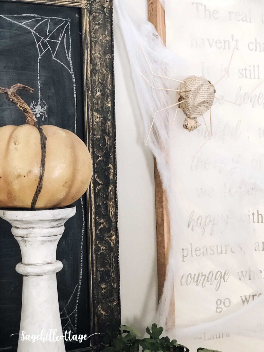 Its always easier to decorate around what you have ..so instead of removing all my signs with quotes that perhaps are not Halloween themed I just covered them up with .99 cent spider web…