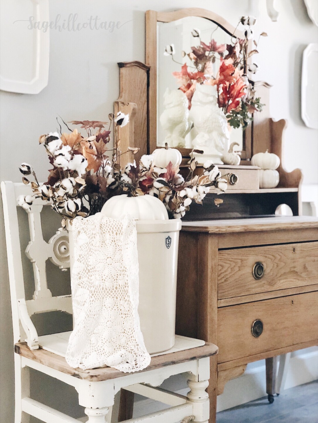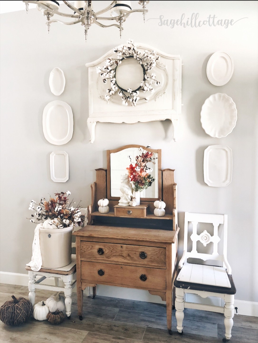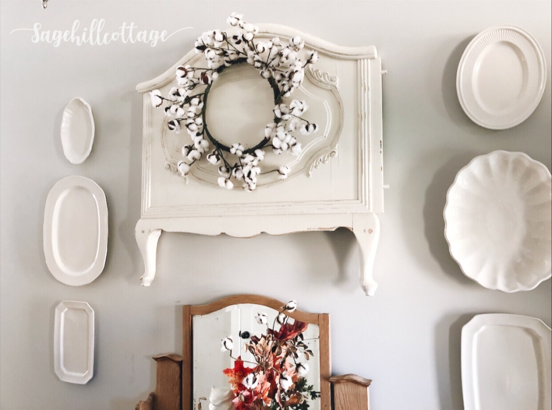 Having the antique headboard up on this wall has been SO fun to decorate around. I added a cotton wreath and than some faux fall foliage mixed with fresh oak branches. A few simple white pumpkins and a crock full of fall goodies makes this space an easy decorating project.