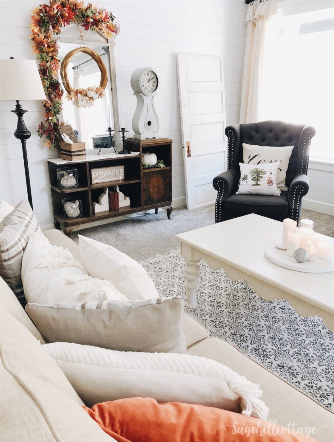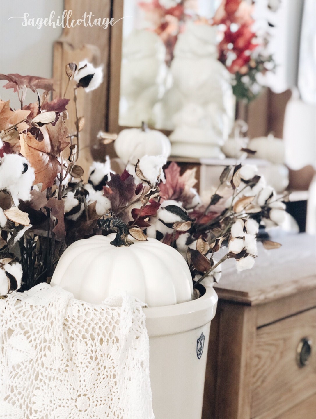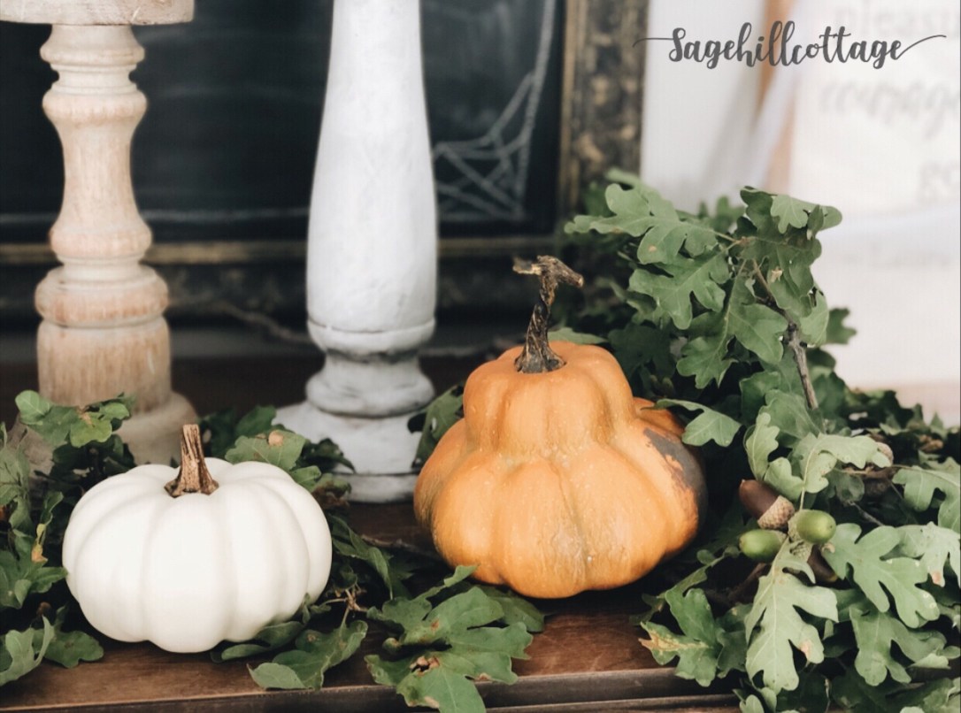 Having the antique headboard up on this wall has been SO fun to decorate around. I added a cotton wreath and than some faux fall foliage mixed with fresh oak branches. A few simple white pumpkins and a crock full of fall goodies makes this space an easy decorating project.