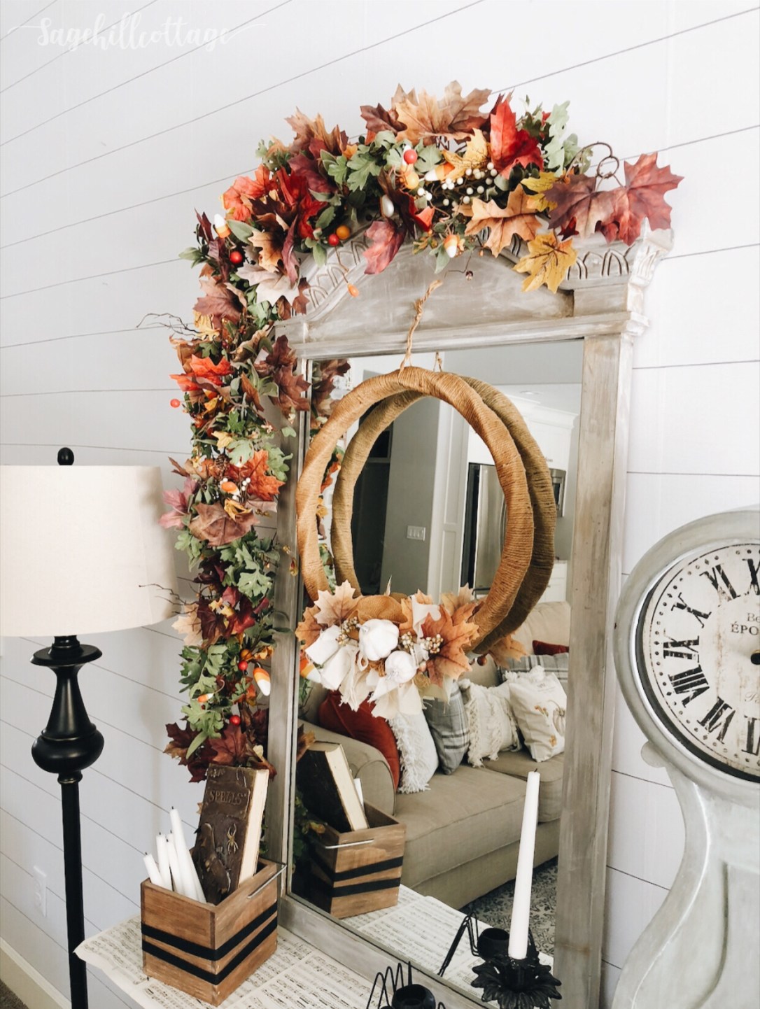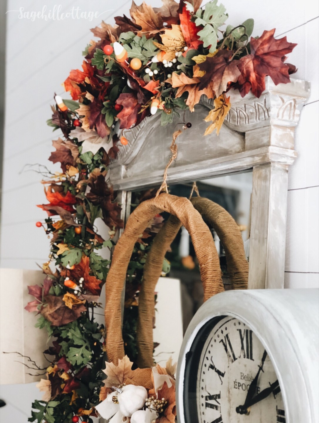 First I started out with a basic green garland. Its actually a Christmas garland from Hearth and Hand ( Lambs ear with white berries). I used that mixed in with another simple maple leaf fall garland that I found for 5$ at my local Family Dollar store. After winding it all together I placed it on the edge of the mirror with some duck tape. Next I added some floral picks of various colors from Hobby Lobby, as well as the candy corn picks that I found several years ago. Last I added the real Oak tree pieces (FREE) that was part of our trip to the park. So basically use what you already have and just spend a little bit to get some extra depth and texture. I really only spent maybe 5-7$ on this garland because I had things in my decor stash that I could already use. WIN WIN! *If you have to start from scratch just find several cheap or clearance garlands at the end of the year and start a collection that way.