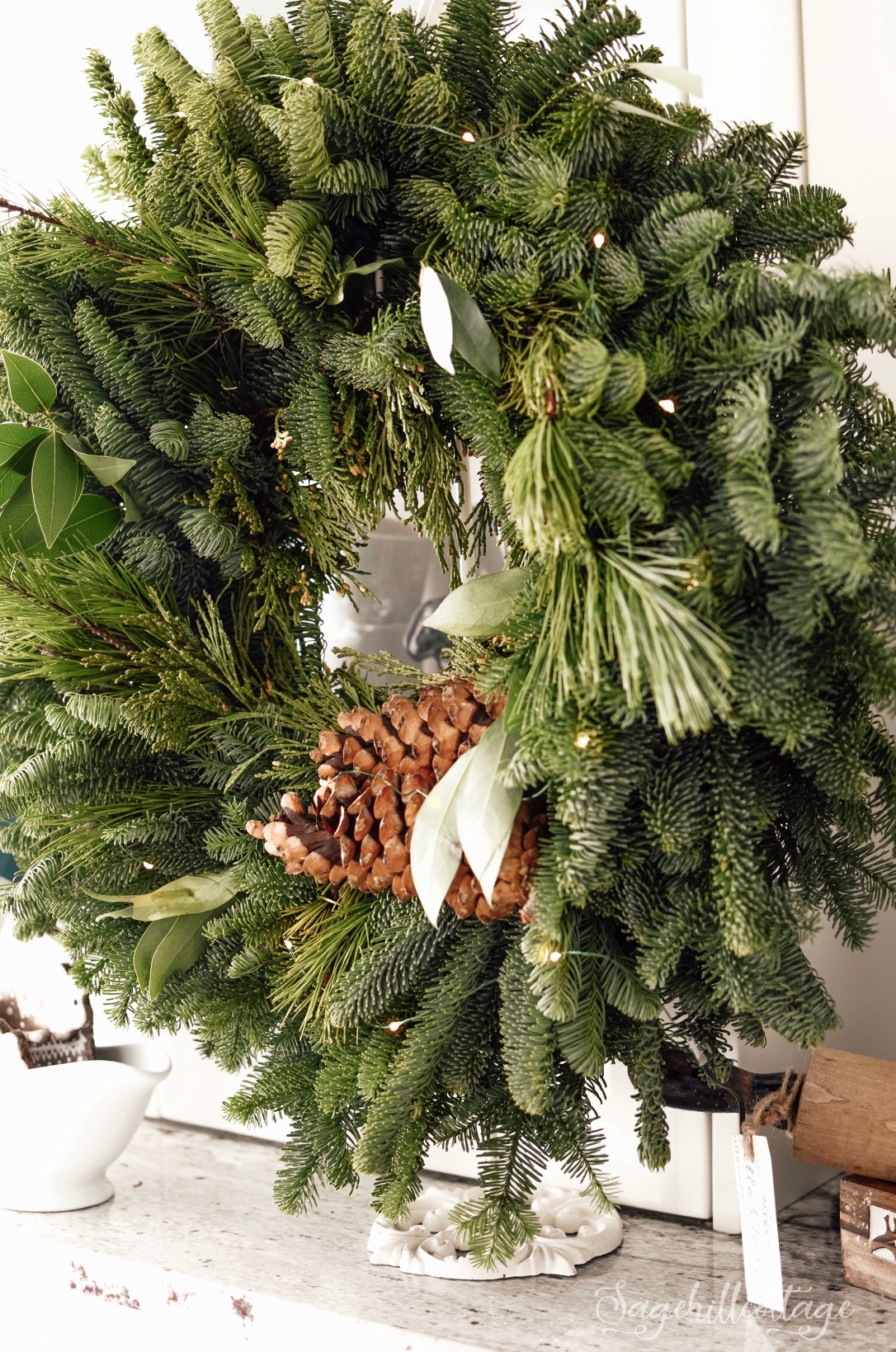 It was so hard to choose which one I liked the best…They have so many gorgeous things to choose from! This Blended Bay Wreath was just calling my name and I knew it would fit into my style of home etc….. I absolutely adore the textures and the different variations of pine as well as the couple of sprigs of bay leaf and pine cones… it’s just beautiful. I added a tiny little twinkle light into the wreath while I photographed this…and I love how it adds a bit of whimsy to it .