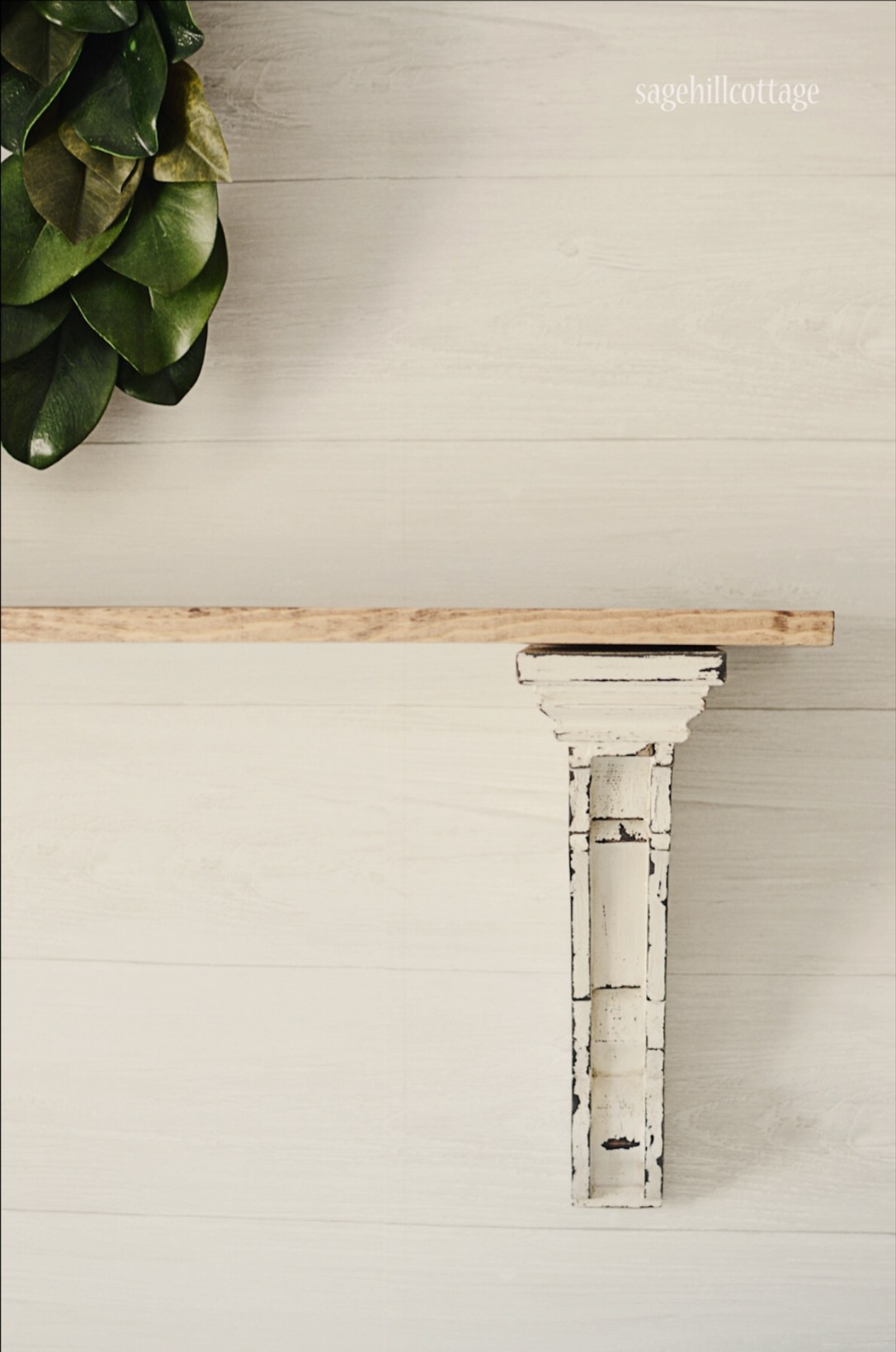 This room is one of my favorites to date. I used some Shiplap peel and stick wallpaper, a DIY corbel shelf and just a lot of pretties in here.