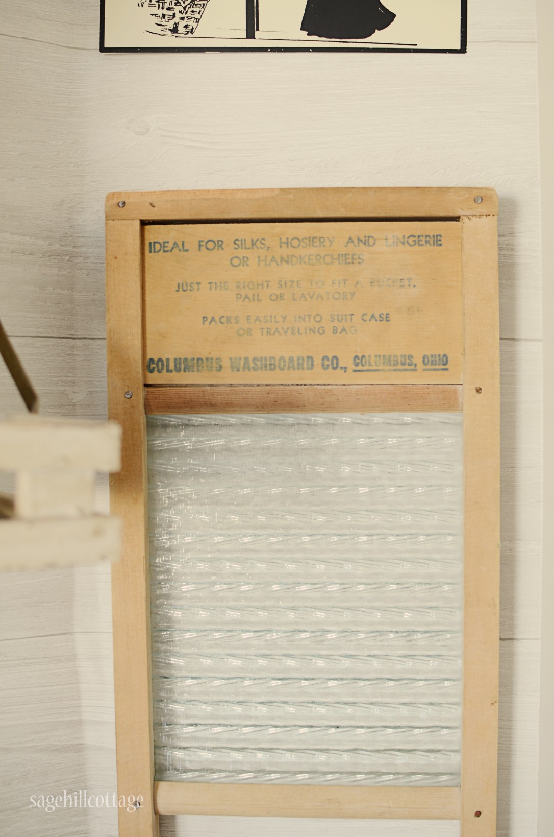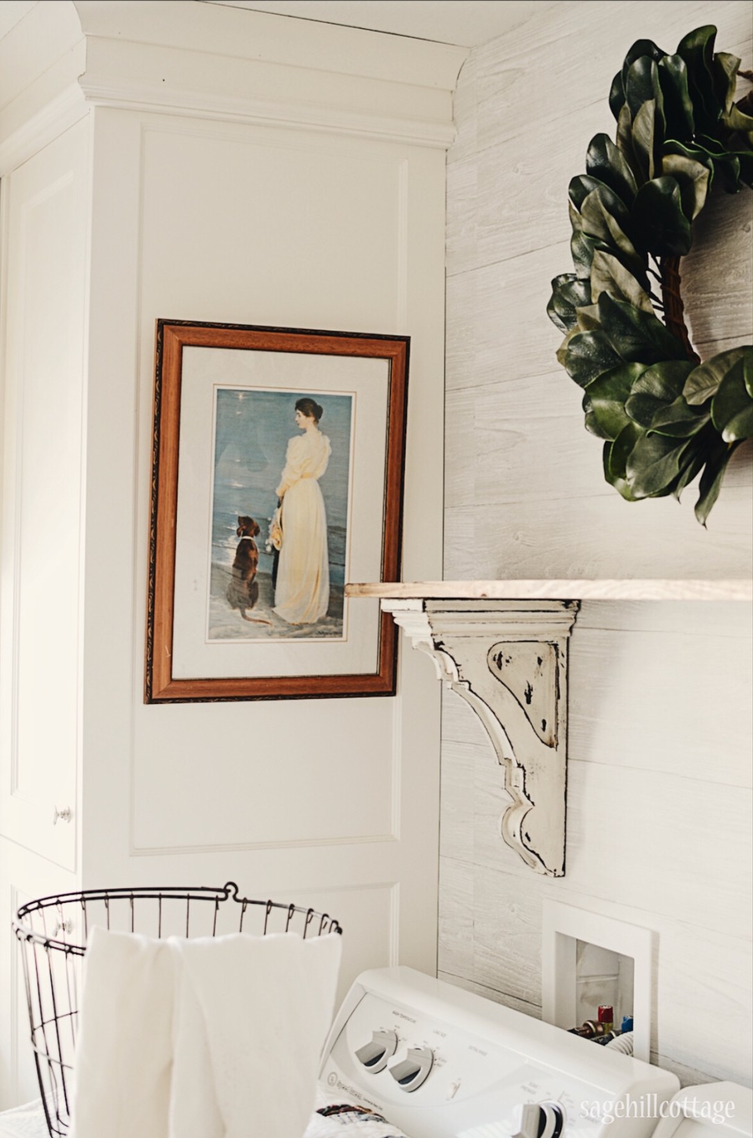 I used lots of antiques in this space. Added the jute rug for some texture, a simple art piece and basket for organizing the laundry.