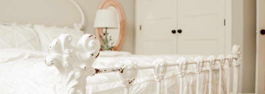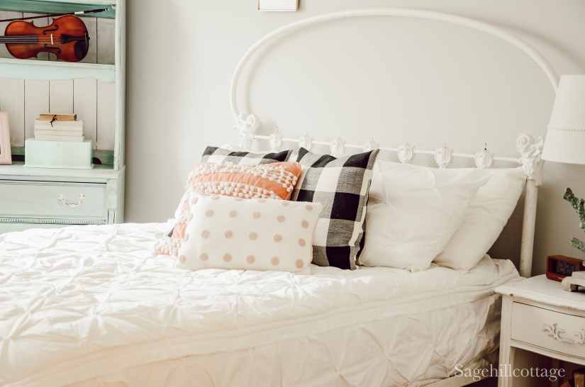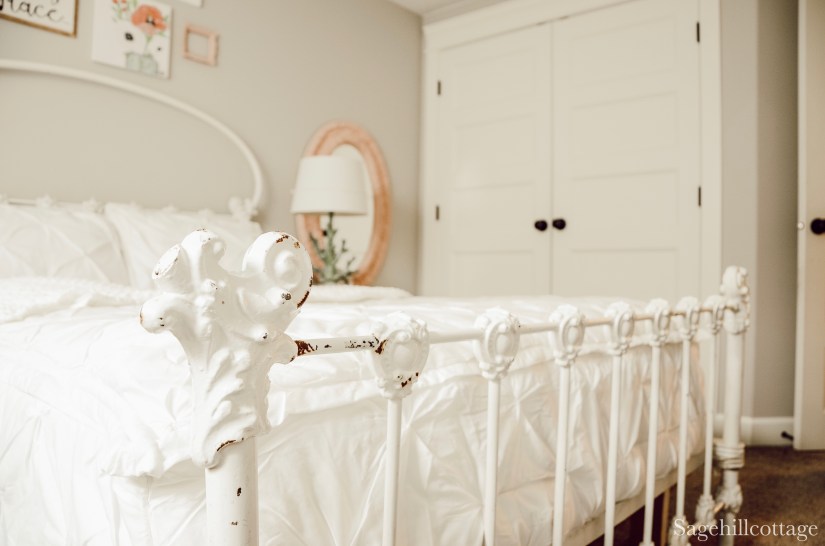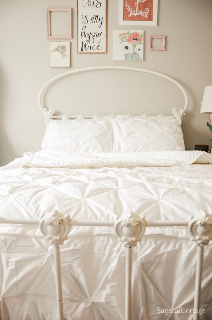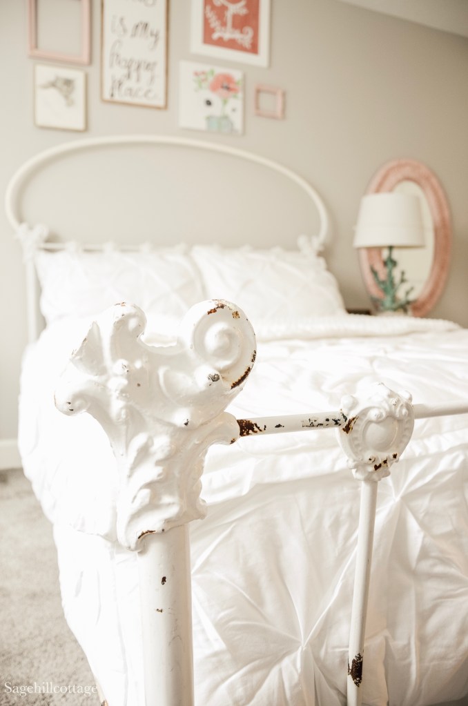 Simply White Beddy’s bedding worked perfectly for this space I think. I used the Full size for this bed. The beautiful diamond gathering on this comforter is SO beautiful…and I think was simple enough to still let the beauty of this antique bed stand out.