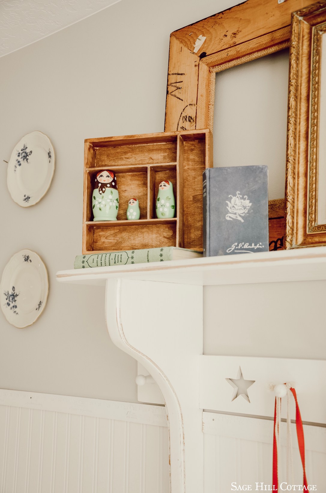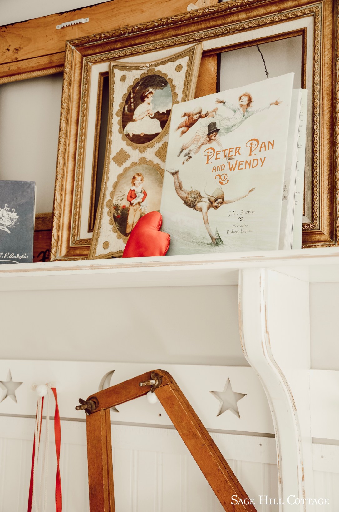 Mixing in some of my favorite Children’s books, layering old wood/gold frames and Knick knacks makes this space feel collected yet cozy.