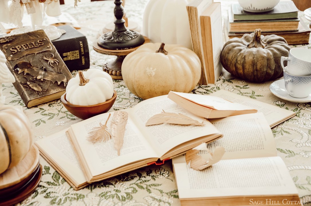 I also added lots and lots of old vintage books. Even an old DIY Spellbook that one of my (Insert Sanderson Sisters Voice here -“Sistaaaa!” taught me how to make years ago. These books are in all sorts of languages mind you, being that our magical friends might be from near or far. It’s been mighty windy these days and you never know what direction they will be coming from!