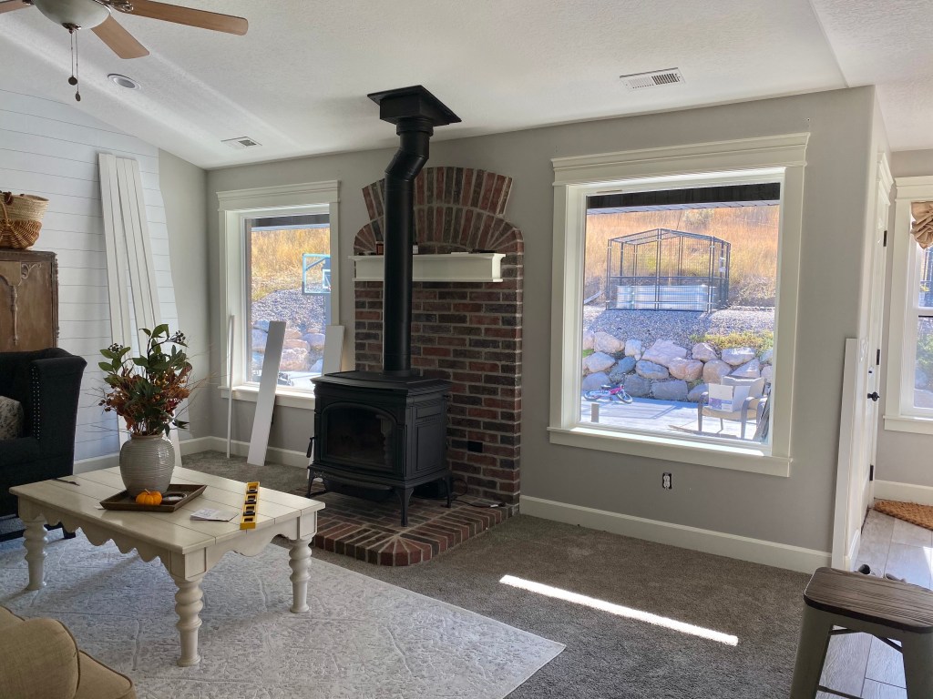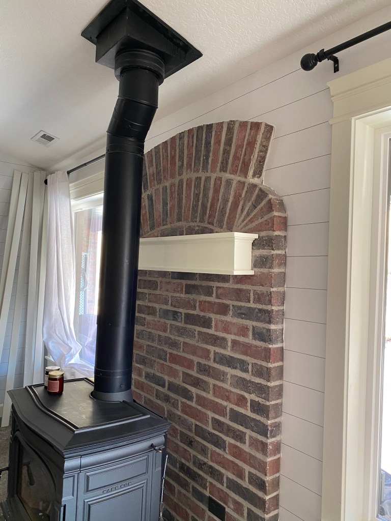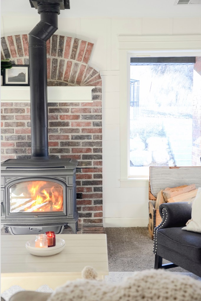 Once the Hearthroom area was done I trimmed up the edges with Wallplanks trim. I highly recommend using them! They came in a package of two 4 ft pieces. It takes the install and overall finished look to the next level of amazing! I installed the wallplanks up the wall but not all the way to the ceiling, because my plan was to create a different accent trim to the top of the shiplap.