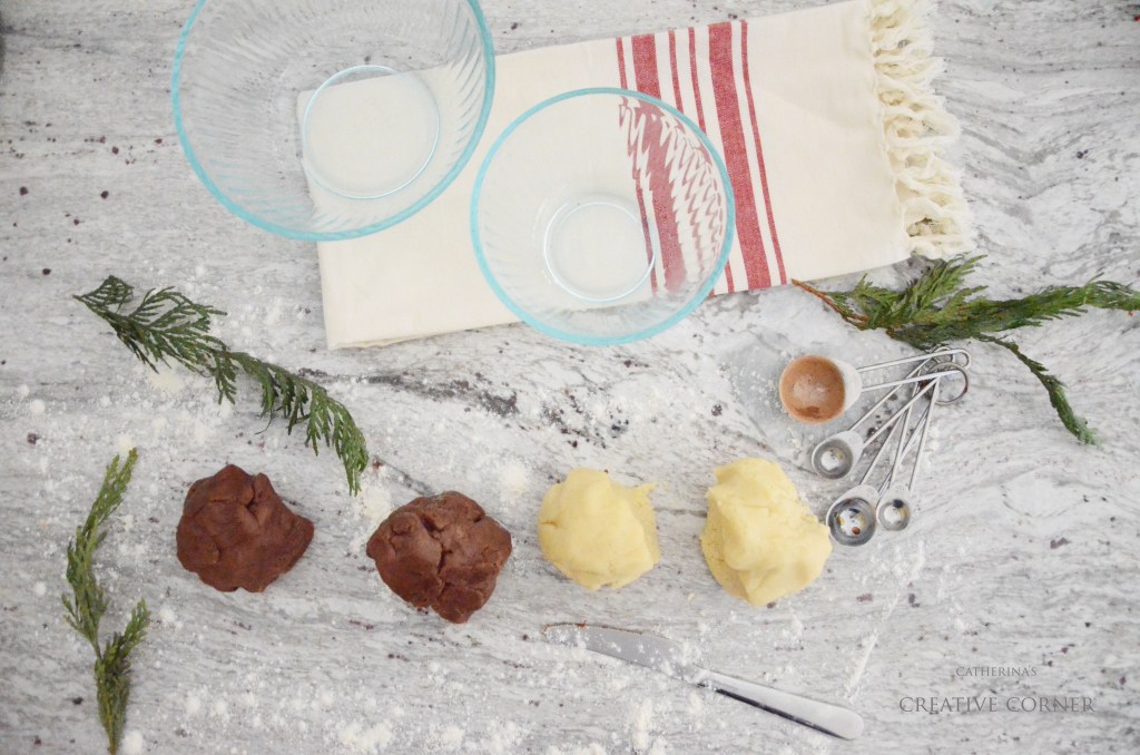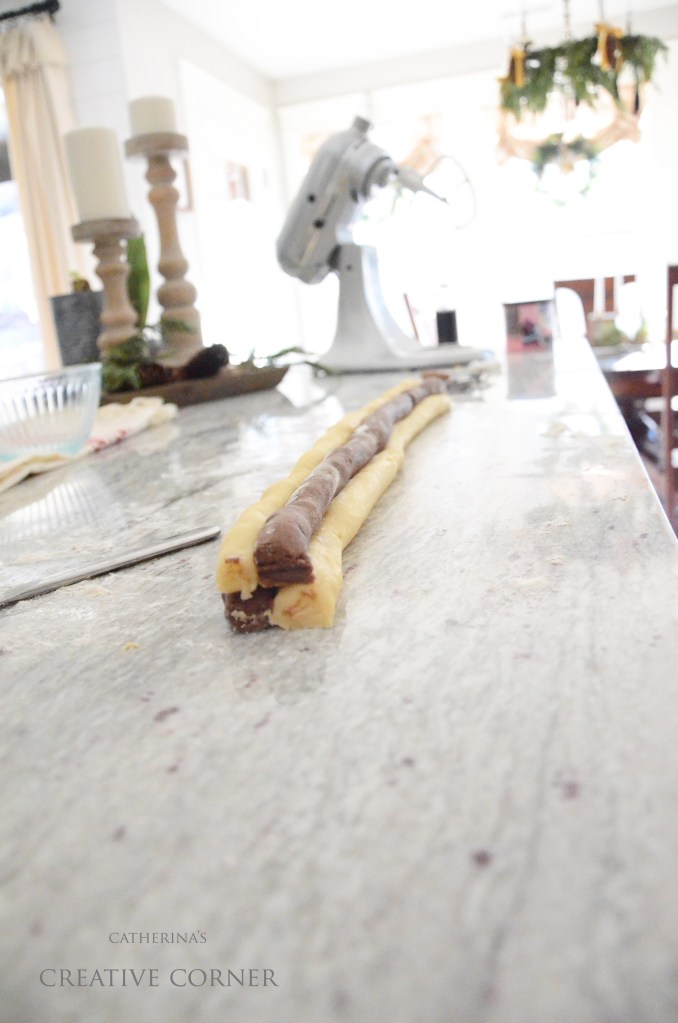 5. Divide each type dough into two and roll into long rolls, four in total (about 3/4-inch round.) Assemble your cookie dough by first placing a light colored roll, next to a chocolate roll, then layer on top the last two rolls, but in reverse pattern. (This will create the checkered look)
